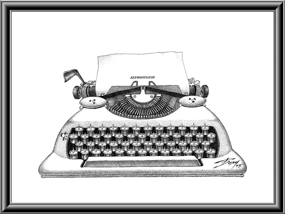 Look — the machine is ordinary, almost gentle in its outline, yet its keys are thorns. Every pressed symbol hurts. “Autobiography” — a word written in blood, not in ink.