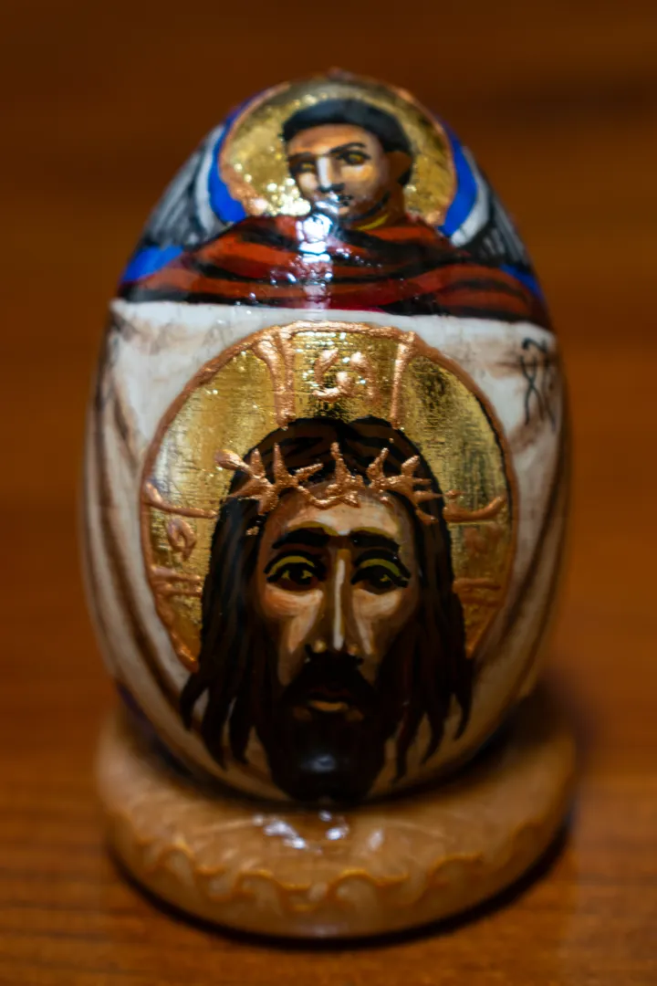 Icon on Wooden Egg — Christ Acheiropoietos Hand-painted icon using classical technique by Mila Vasileva Miniature on a wooden egg. Egg tempera, gold leaf. Height - 8 centimeters Available Icon on Wooden Egg — Christ Crucified → Back to list