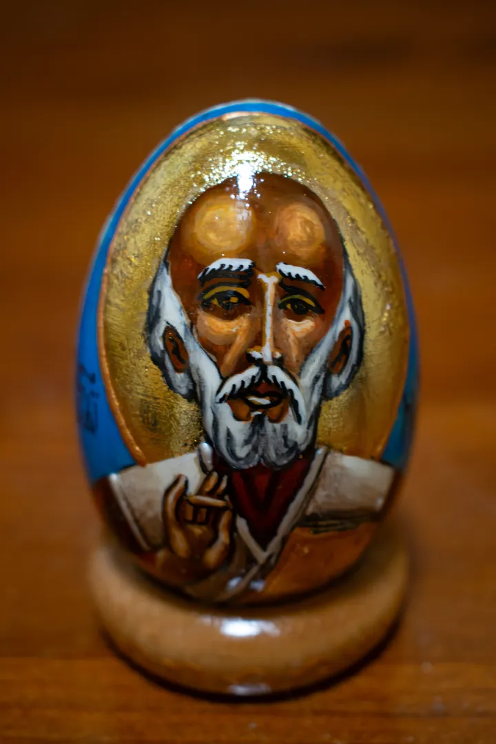 Icon on Wooden Egg — Saint Nicholas the Wonderworker Hand-painted icon using classical technique by Mila Vasileva Miniature on a wooden egg. Egg tempera, gold leaf. Height - 8 centimeters Available ← Icon on Wooden Egg — Archangel Michael Icon on Wooden Egg — Saint Petka → Back to list