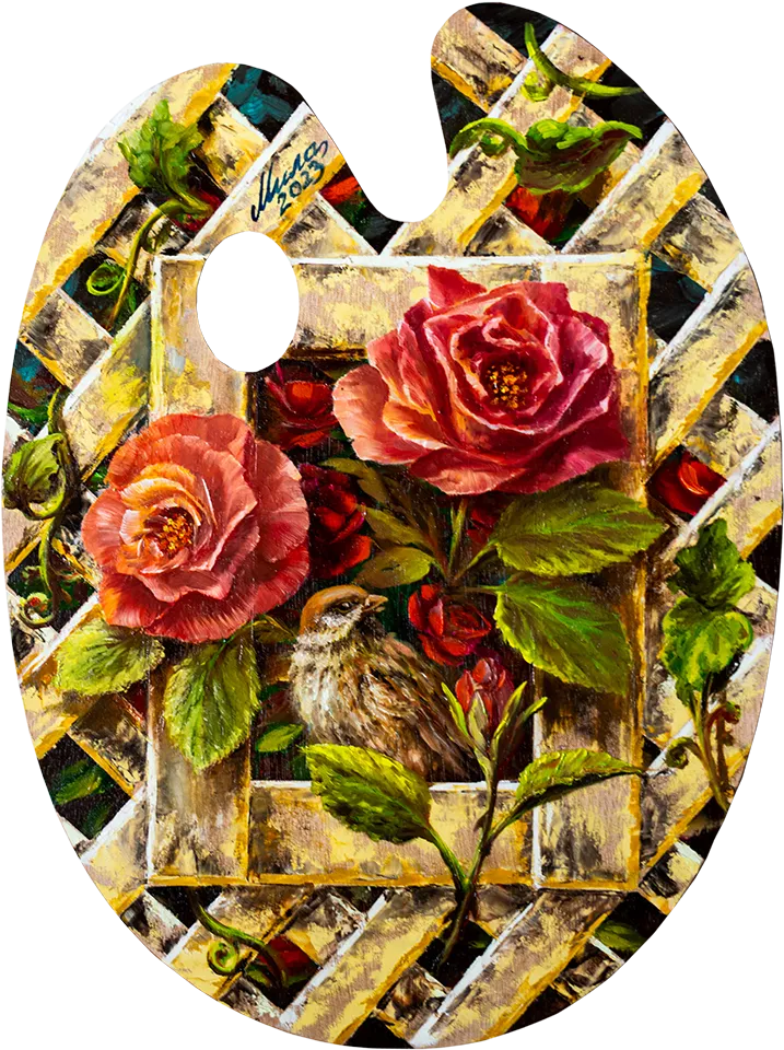 Palette — The garden with the sparrow Painting by Mila Vasileva Oil on palette, 30x40 cm. In a private collection.Similar work can be created upon request ← Palette — The garden with the titmouse Palette — Sparrows in the summer → Back to list