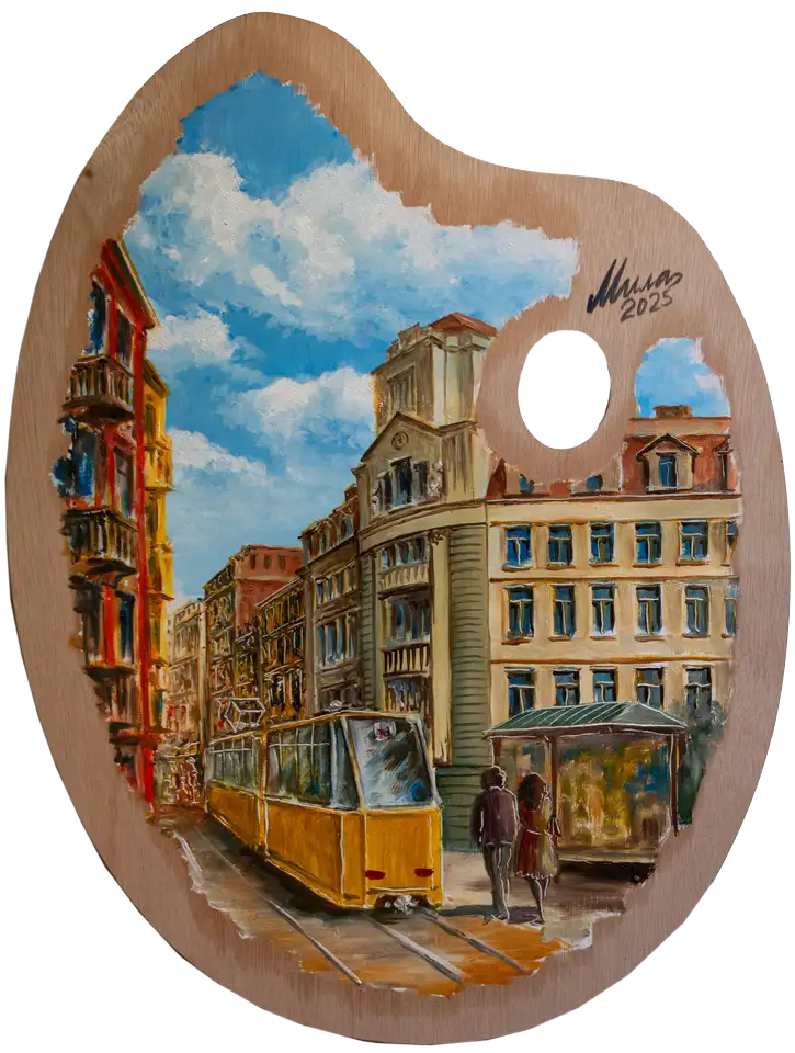 Palette — Graf Ignatiev Str. Painting by Mila Vasileva Oil on palette, 30x40 cm. Available. ← Palette — A walk in the rain Palette — A walk in the park → Back to list