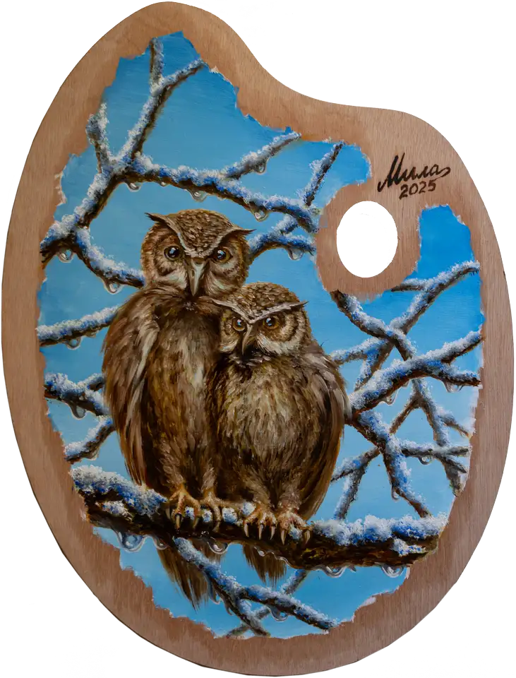 Two little owls, nestled into one another, rest on a branch dressed in frost. Their feathers are steeped in patience, in that ancient wisdom that neither hurries nor cries out. Their eyes — deep, awake, all-seeing — look upon the world as it was before humankind and as it will be after.