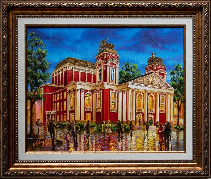 Old Sofia — National Theater at evening Painting by Mila Vasileva Oil on canvas, 30x40 cm. In a private collection.Similar work can be created upon request ← Old Sofia — National Bank Old Sofia — National Theater → Back to list