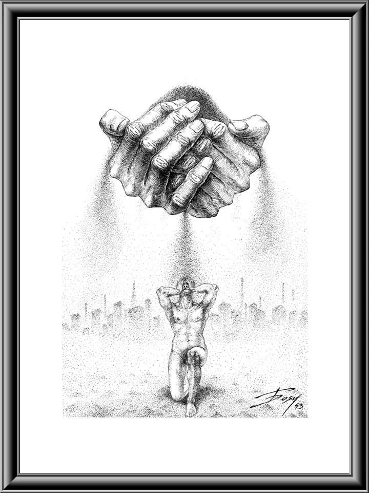 The man kneels, unclothed, unprotected, under the shadow of enormous hands that open and release the sand — time, life, his essence.