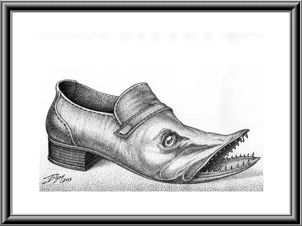 The fish with the skin of a shoe, or the shoe with the face of a fish — you cannot tell which has swallowed which.
