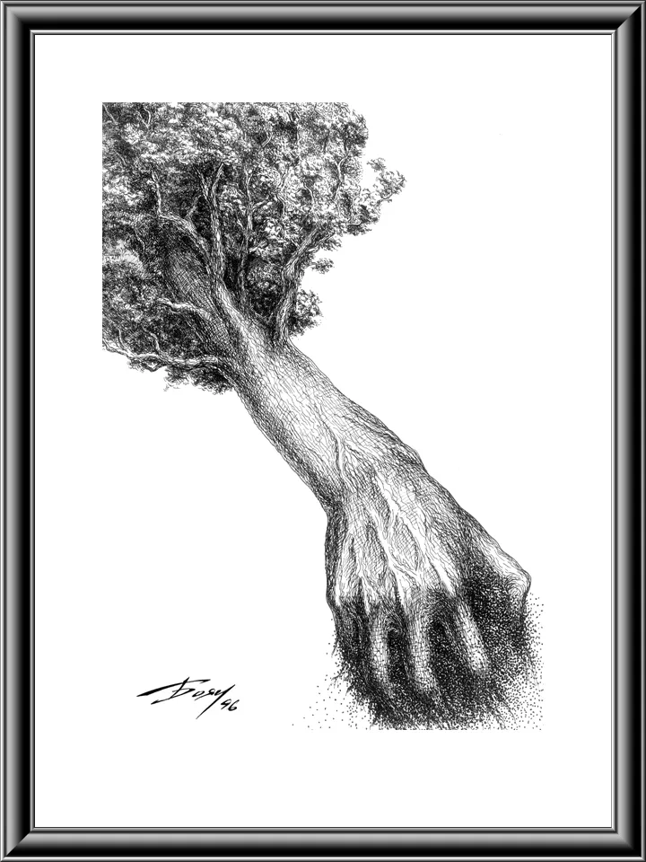 Boyan has captured that moment when nature and human are no longer separate beings — one hand holds the other, sap becomes blood, and the storm turns inward.