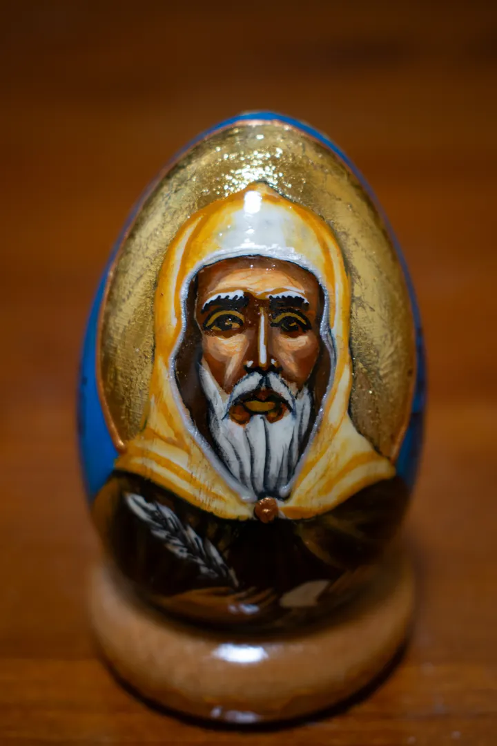 Icon on Wooden Egg — Saint Anthony Hand-painted icon using classical technique by Mila Vasileva Miniature on a wooden egg. Egg tempera, gold leaf. Height - 8 centimeters Available ← Icon on Wooden Egg — Virgin Mary Icon on Wooden Egg — Saint Catherine → Back to list