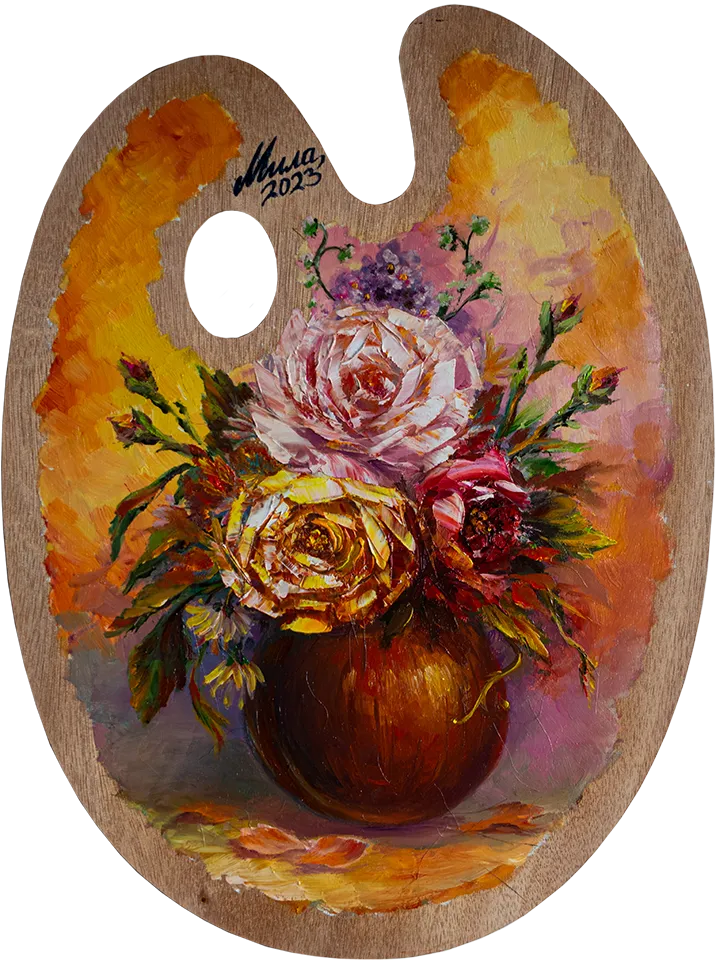 Palette — Flowers (01) Painting by Mila Vasileva Oil on palette, 30x40 cm. In a private collection.Similar work can be created upon request ← Palette — Ballet shoes Palette — Wind → Back to list